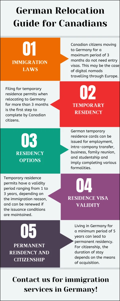 People who move to Germany from Canada can also bring their family members with them, as long as they have obtained residence or settlement permits. Relocating with relatives can occur upon immigration or after the Canadian citizen has already become a German resident.