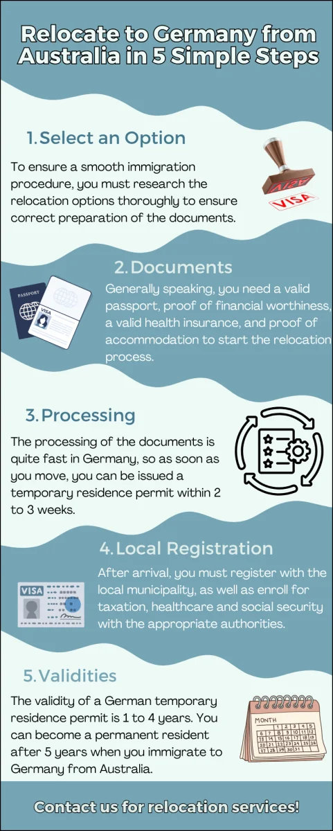 In the case in which we refer to long-term relocation, which is defined as a stay with a duration of at least 90 days, then, Australian citizens are required to apply for a visa. Foreigners should also consider that, when immigrating to Germany for a long-term period, they must apply for a residence permit.